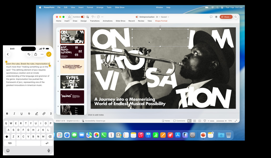 Say you start writing an email on your iPhone, but you want to finish it on your Mac. Or you start writing a report on your iMac, but want to continue on your iPad as you head to your meeting. Handoff makes it possible — and totally seamless. When your Mac and your iPhone or iPad are near each other, they can automatically pass what you’re doing from one device to another.3 An icon representing the last app you were using will appear on your second device — in the Dock on your Mac or iPad or in the App Switcher on your iPhone. Just click or tap to pick up right where you left off without having to search for the file. Handoff works widely across the system and can even work with third‑party apps.