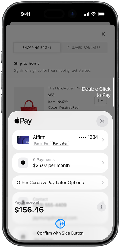 Apple Pay gives you flexibility at checkout when you shop in stores with iPhone, or online and in apps with iPhone or iPad. You can choose to pay in full or split your purchases into smaller payments over time through an eligible card or other pay later provider.2 You can also use your eligible credit or debit cards’ rewards, points, or miles to cover all or part of your purchase.3 When you redeem rewards, a statement credit is applied after the transaction is complete.
