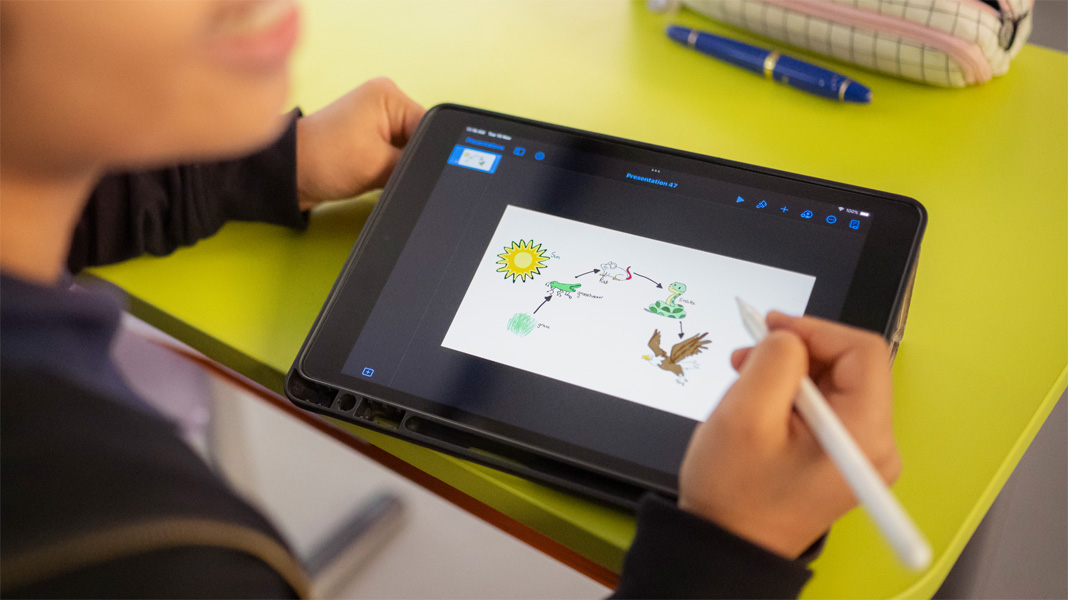 In one biology lesson, students create animated GIFs in Keynote, bringing the system of interdependent food chains to life and deepening their understanding of the subject matter — all while learning valuable creative skills. And with Apple TV in every classroom, students easily share their creations and learnings with the class.