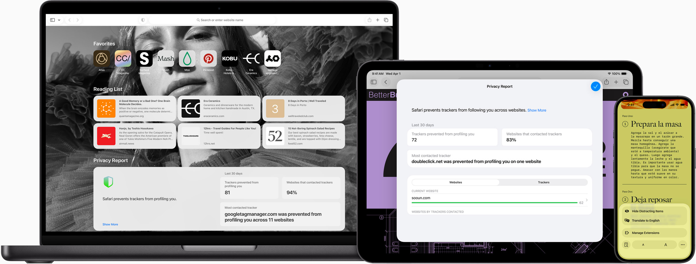 Con Safari, es muy fácil saber cómo se protege tu privacidad en cada sitio web que visitas. Haz clic en Reporte de Privacidad en el menú de Safari para ver al instante un resumen de todos los rastreadores a los que el sistema les impide crearte un perfil en las páginas web que visitas. También puedes consultar el Reporte de Privacidad semanal que te muestra cómo Safari protege tu navegación en cada momento.