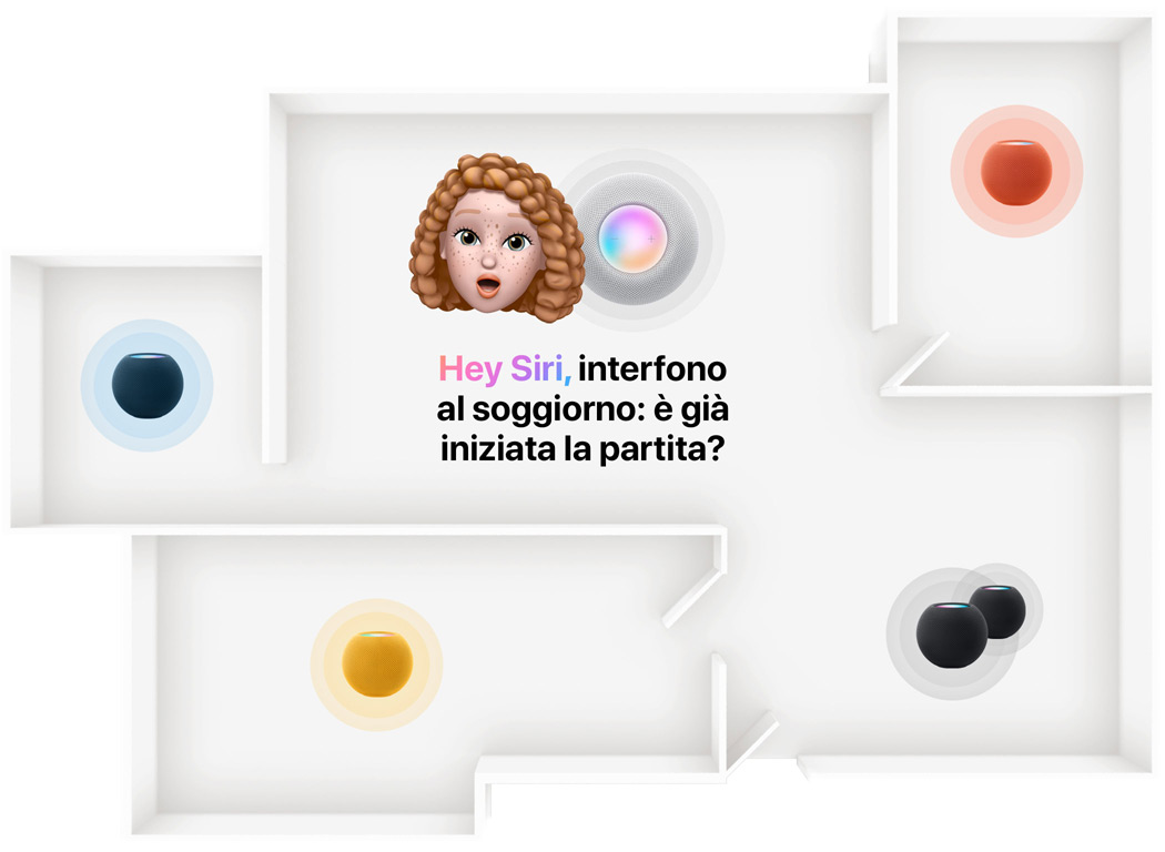 Sei Memoji disposte in cerchio intorno a un HomePod mini giallo visto dall’alto. Accanto a tre Memoji ci sono dei fumetti blu che dicono “Ehi Siri”.