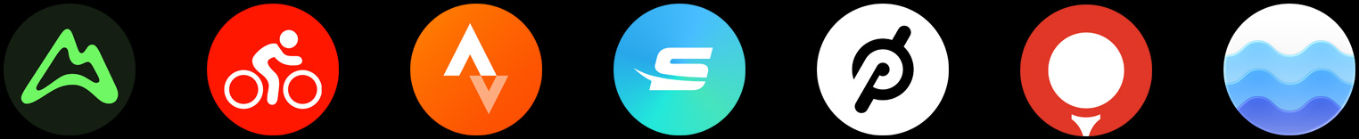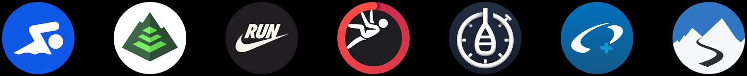 Featured apps: AllTrails, MapMyRide, Strava, Swim.com, Peloton, Golfshot, Tides, MySwimPro, Gaia GPS, Nike Run Club, Redpoint, Paddle Logger, Oceanic+ and Slopes.