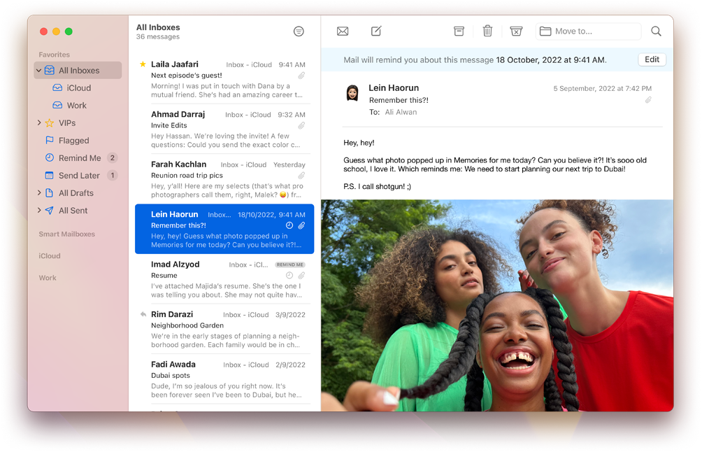 Messages keeps you in control of your conversations with the ability to edit, give Tapbacks, and undo sent messages. When you sync Messages in iCloud, your conversations always go smoothly since every message is backed up, end‑to‑end encrypted, and kept in sync across all your devices.