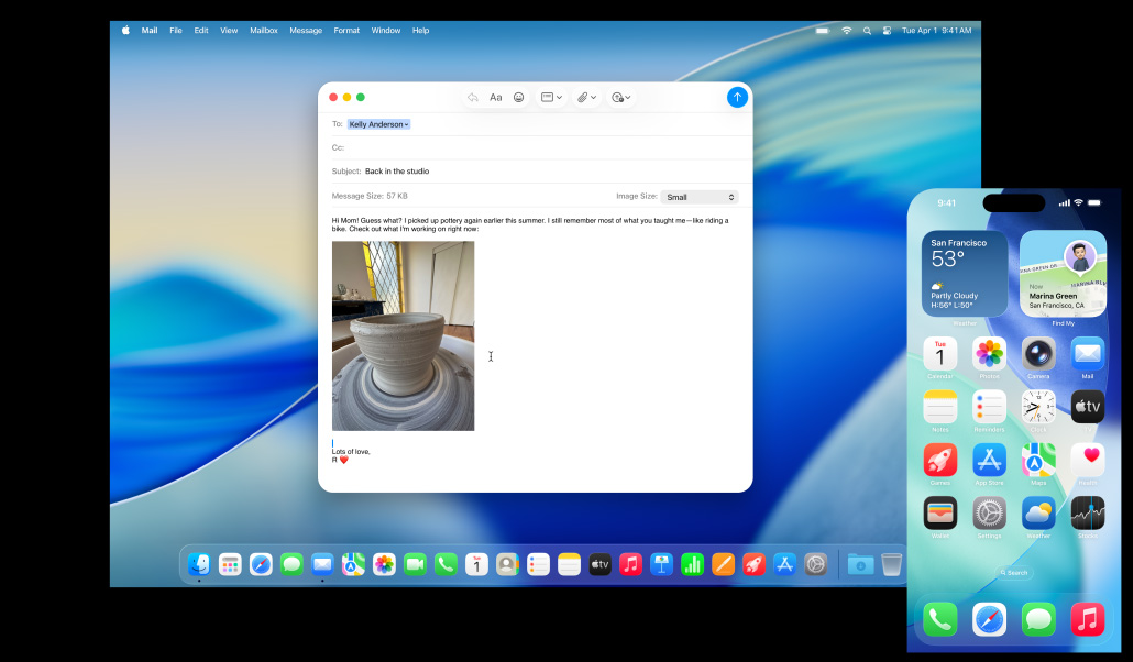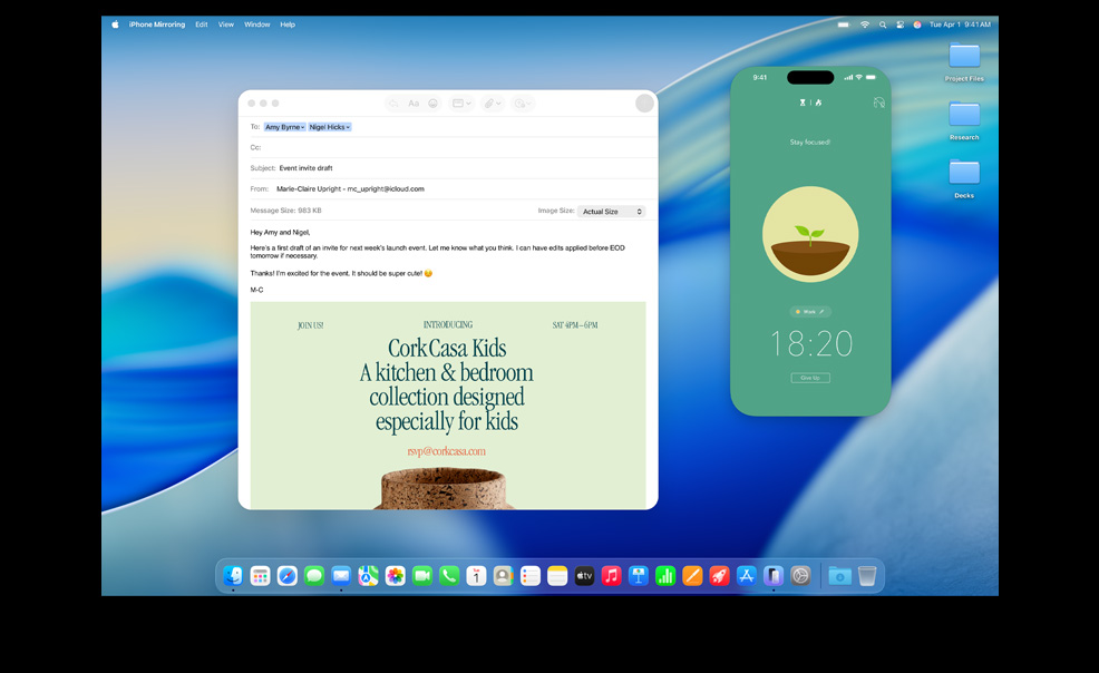 iPhone Mirroring lets you see and use your iPhone from your Mac.5 So even if your phone is charging across the room, you can still access all your favourite iPhone apps. You can even drag and drop a video from your iPhone Photos app straight onto your Mac desktop. Live Activities from your iPhone also appear on your Mac. So when timely events occur, you don’t have to reach for your phone to stay in the know.