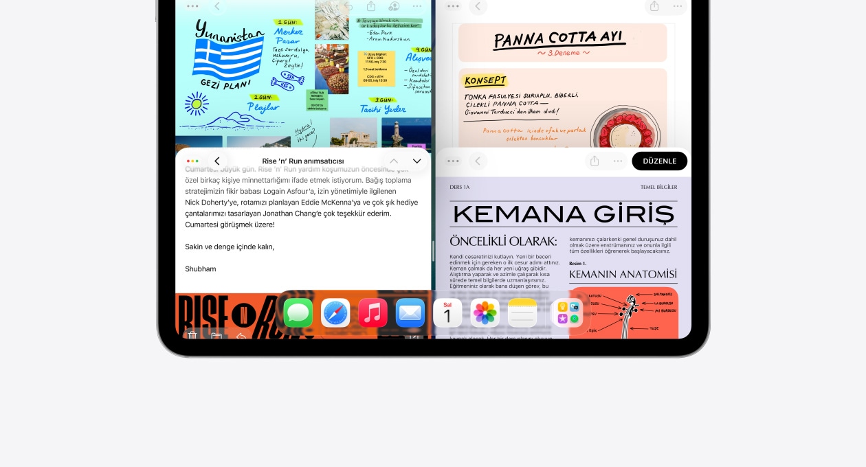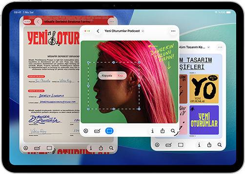 iPad, üç model, yatay pozisyonda, ortadaki model diğer ikisinin önünde duruyor, Apple Pencil ortadaki modelin üstüne manyetik olarak yapışmış, ortadaki ekranda Liquid Glass efektli renkli uygulama simgelerinin yer aldığı Ana Ekran görünüyor, soldaki ekranda Önizleme uygulaması görünüyor, sağdaki ekranda ise yelpaze şeklinde açılarak Dock’tan yukarı doğru çıkan dosyaların bulunduğu Ana Ekran görünüyor
