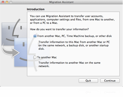 系統移轉輔助程式透過傳輸檔案、音樂、照片、應用程式、網路設定和偏好設定,簡化了從 Mac 或 Windows 電腦在 Mac 間轉移資訊的過程。只需使用 FireWire 或乙太網路線連接兩台 Mac 即可。如果使用 Time Machine,你可用 Time Capsule 透過 USB 或無線方式連接 Time Machine 備份磁碟,以傳輸備份裡的檔案。從 Windows 傳輸文件到 Mac 一樣容易。