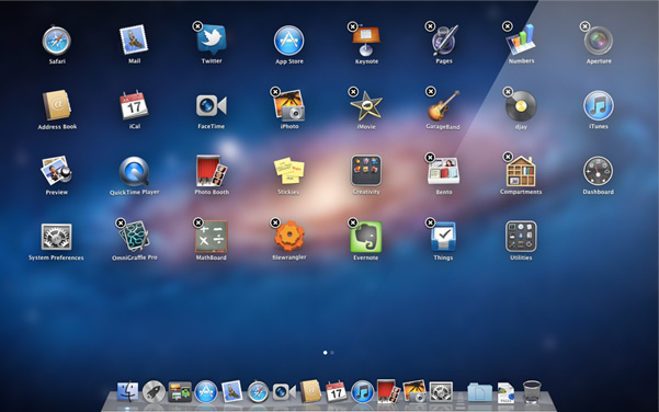 點選 Dock 上的 Launchpad 圖像,已經開啓的視窗就會散開,取而代之的是顯示 Mac 裡所有的應用程式表列。每個應用程式均以圖像代表,且根據你的需求,Launchpad 可以持續增加頁面,來容納所有應用程式的圖像。在軌跡板上滑動,即可在不同頁面間進行切換,點按一下, 就可以開啓任何應用程式。